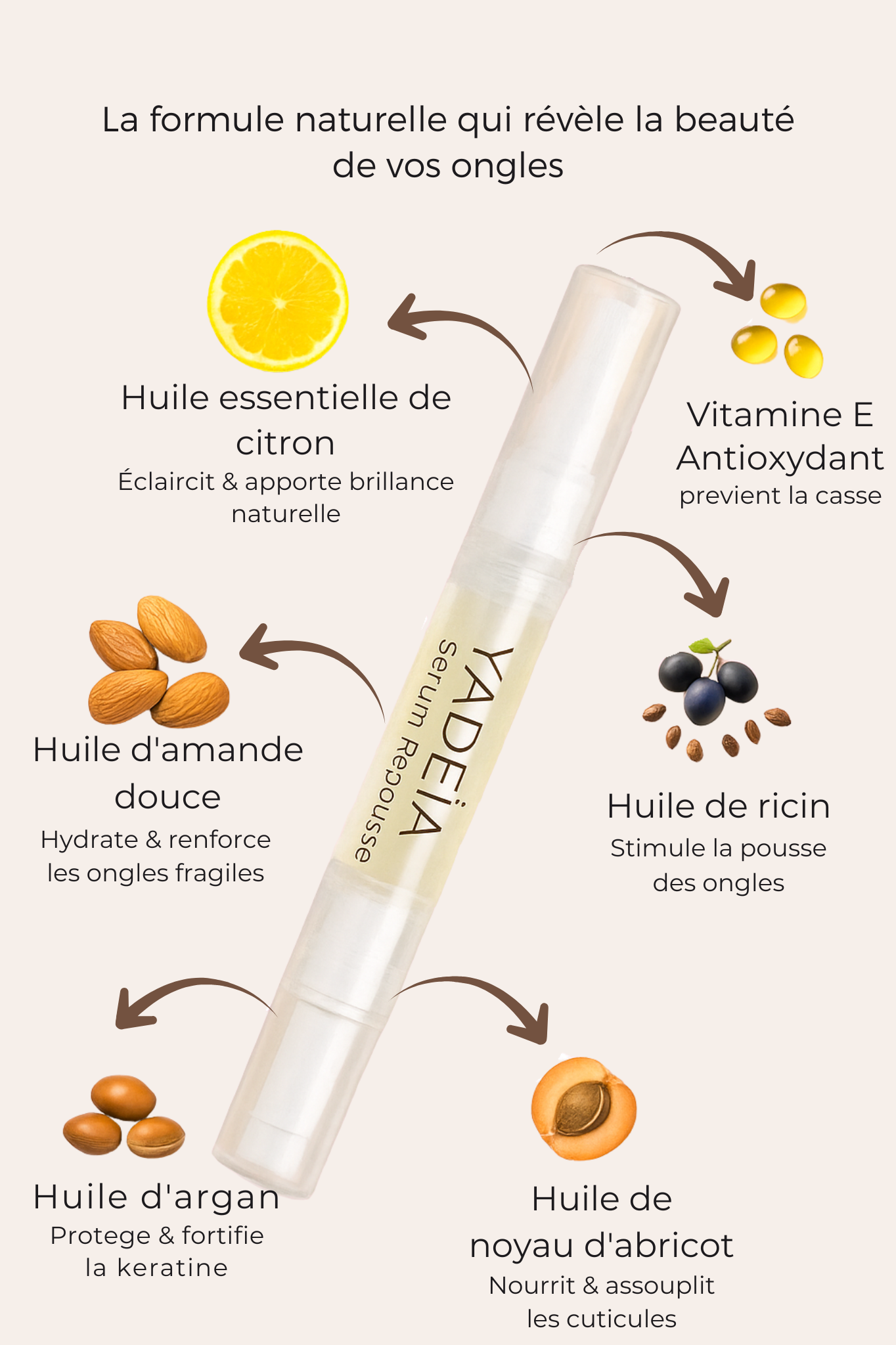 Le Sérum Repousse nourrit et stimule en douceur. Huile de ricin, abricot, amande, argan, vitamine E, touche de citron : un bain d’éclat pour des ongles plus longs, plus souples, plus lumineux au fil des jours.